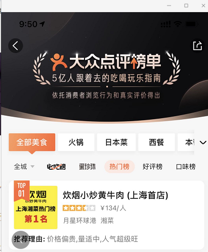 大众点评作为上海人民吃喝玩乐重要的参考指标,能否榜上有名,成为许多商家最关心的问题。凭借鲜嫩、多汁的口感,炊烟小炒黄牛肉这款“爆品”征服了一大波食客的味蕾。据了解,在五一试营业期间,炊烟2天登上上海湘菜热门榜第1,单日连续排队长达12小时。5月13日,炊烟位列上海美食热门榜前3;5月28日,炊烟荣登上海美食热门榜第2;5月29日,炊烟登顶上海美食热门榜。