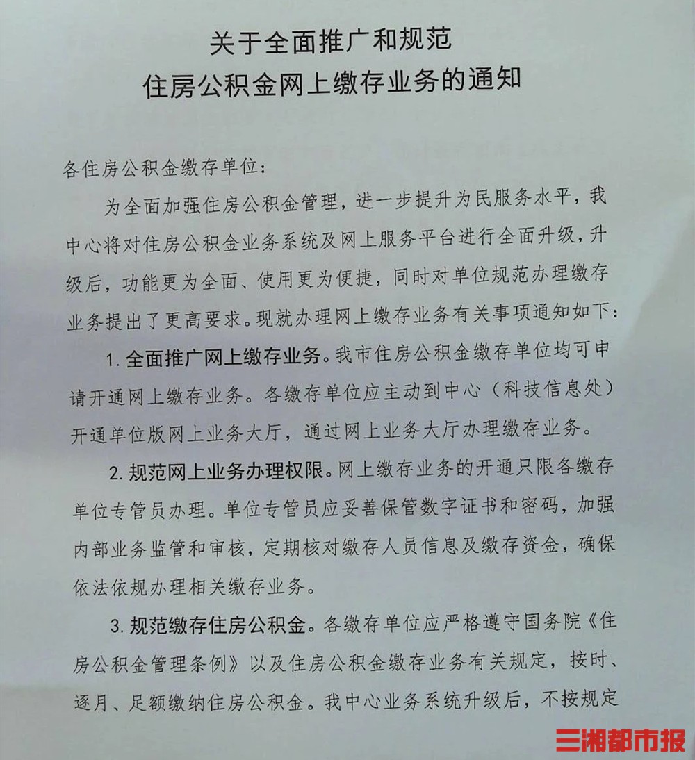 三湘都市报·新湖南客户端6月23日讯(记者 卜岚)今日,记者从长沙住房公积金管理中心获悉,《关于全面推广和规范住房公积金网上缴存业务的通知》已于近日发布。《通知》指出,该中心将对住房公积金业务系统及网上服务平台进行全面升级,全面推广网上缴存业务,加强内部业务监管和审核,定期核对缴存人员信息及缴存资金。