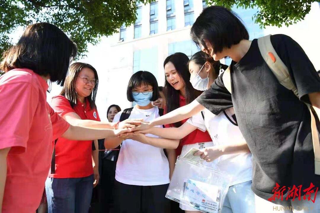 ▲“祝你们旗开得胜”。考点外,送考老师送上祝福。田超/摄