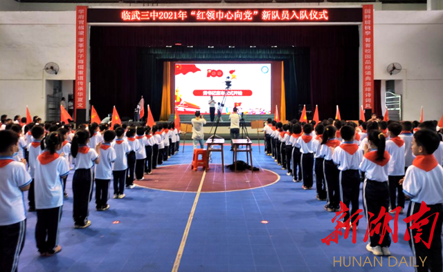 “我是少年先锋队队员,我在队旗下宣誓……”整齐洪亮的入队誓言响彻临武三中体艺馆。6月1日,该校小学部2021年庆六一“红领巾心向党”新队员入队仪式在此举行。382名同学郑重宣誓加入中国少年先锋队。少先队员们高唱队歌,用嘹亮的歌声表达了对组织的热爱。