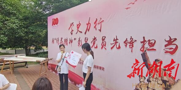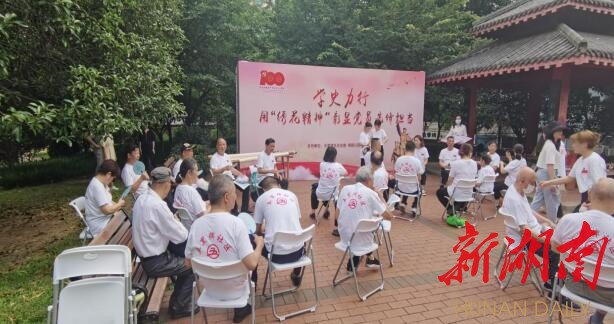新湖南客户端6月15日讯(通讯员 许微)6月15日上午,长沙市芙蓉区五里牌街道五里牌社区晓园公园迎旭亭下的“迎旭课堂”又开课了。由湖南湘绣博物馆田蓉老师现场绣制中国共产党成立100周年庆祝活动标识,用“绣花精神”生动展现了中国共产党团结带领中国人民不忘初心、牢记使命、艰苦奋斗的百年光辉历程。