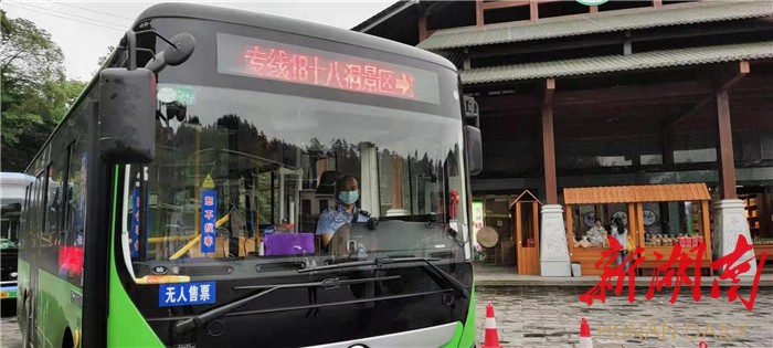 在矮寨景区游客服务中心,一辆编号为18路专线的新能源电动公交车,缓缓驶出,往花垣县十八洞景区开去;在公交车门口“无人售票”的白色字体非常显眼,乘客上车后通过微信、支付宝扫码支付3元车费或者投币,就可安心静坐观看沿途风景,等待到达目的地。