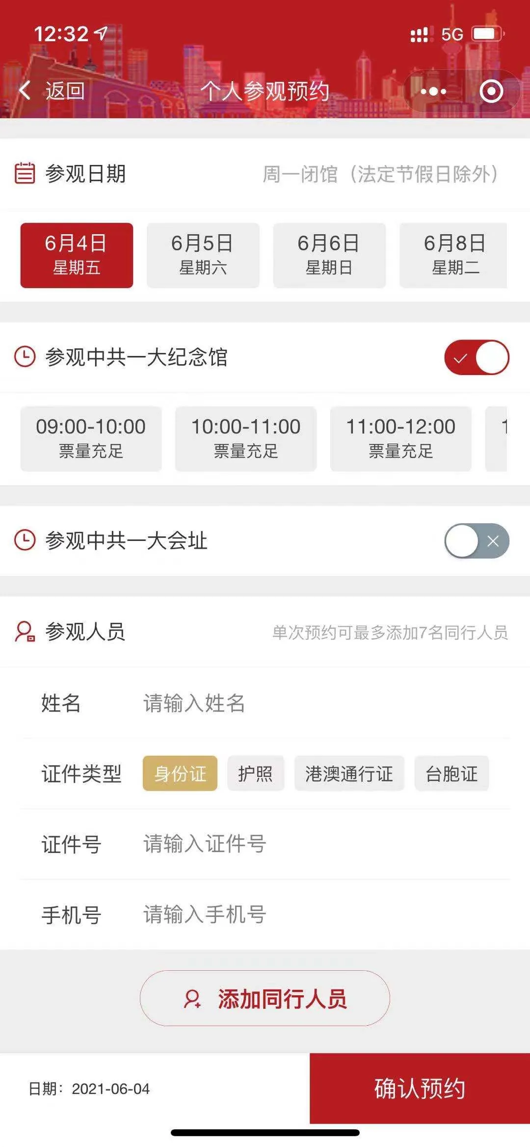 填写参观人员姓名、证件号码、手机号,一位观众最多可以添加七位同行人员。