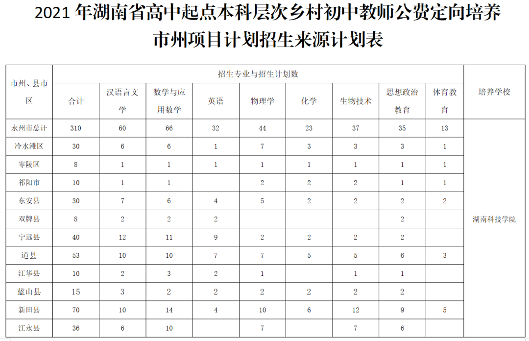 高中起点本科层次乡村初中教师公费定向培养市州项目培养学校为湖南科技学院,初中起点专科层次乡村小学、幼儿园教师公费定向培养市州项目培养学校为永州师范高等专科学校。