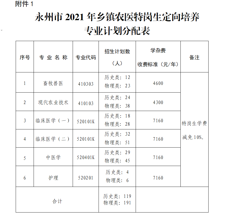 附件:1.永州市2021年乡镇农医特岗生定向培养专业计划分配表