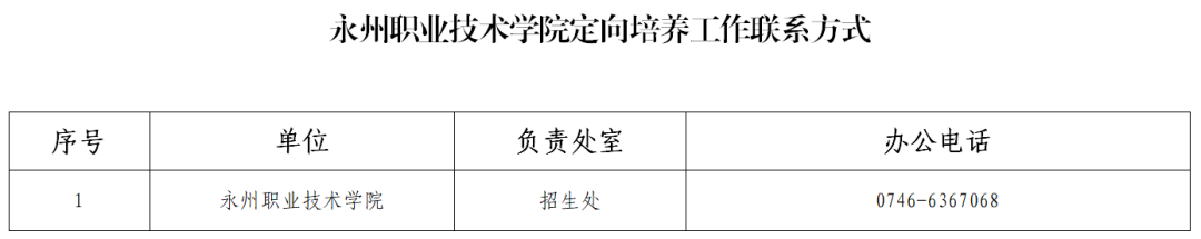2.录取结束后,永州职业技术学院将录取名单报市人力资源和社会保障局,再由市人力资源和社会保障局通知各县市区(管理区)人力资源和社会保障部门根据最终录取考生名单完成《协议书》中县市区(管理区)人民政府(管委会)的签订工作,并于11月1日前将《协议书》共一式三份寄送永州职业技术学院。