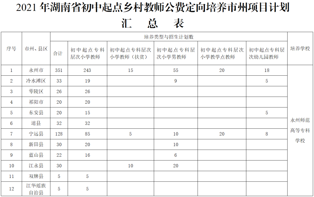 2.初中起点专科层次乡村小学教师公费定向培养市州项目招生计划为333人。其中专科层次小学教师243人,专科层次小学教师(扶贫)15人,专科层次小学男教师55人,专科层次小学教学点教师20人。