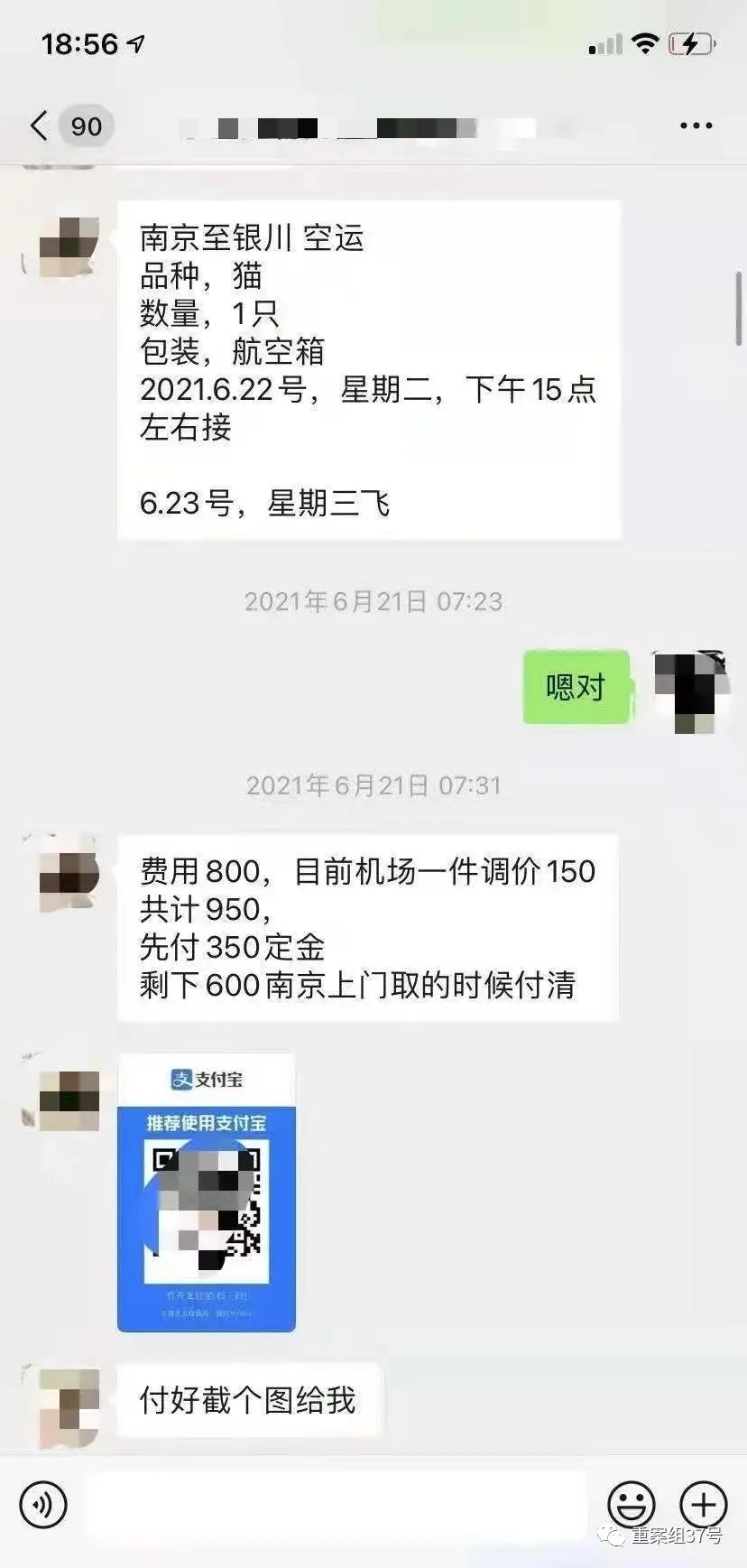 韩可是南京林业大学一名应届毕业生。由于计划毕业后回老家银川工作,她在电商平台上找到一家名为吉祥宠物托运部的商家,与对方商议后,她决定通过空运方式将猫从南京托运回银川。
