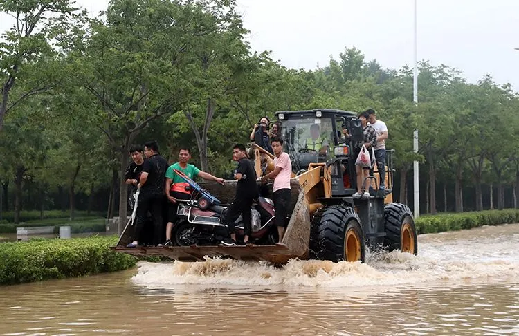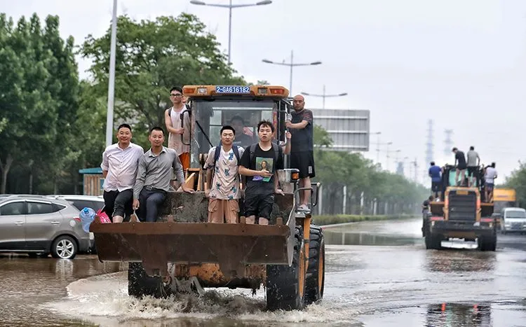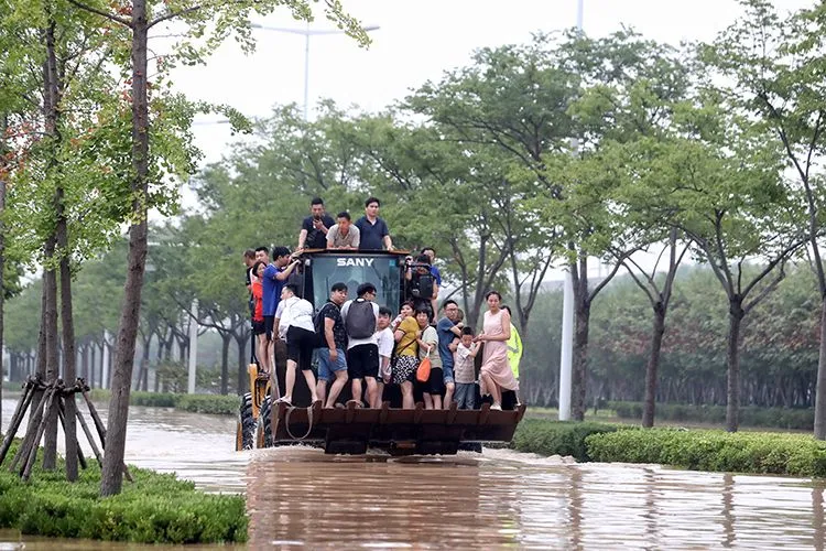 ▲7月21日,郑州,金水东路东四环桥下被困群众乘坐挖掘机前往安全地带。