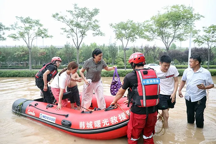 ▲7月21日,郑州,陕西韩城曙光救援队转移在高速被困的张先生一家,张先生20日晚七点开始被困高速,徒步四五个小时后由救援队转移至安全地带。