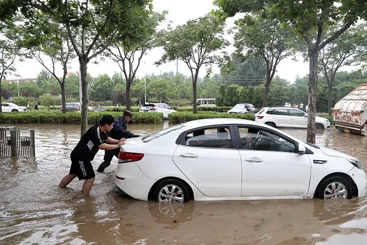 ▲7月21日,郑州,救援队员帮助市民推涉水车辆。