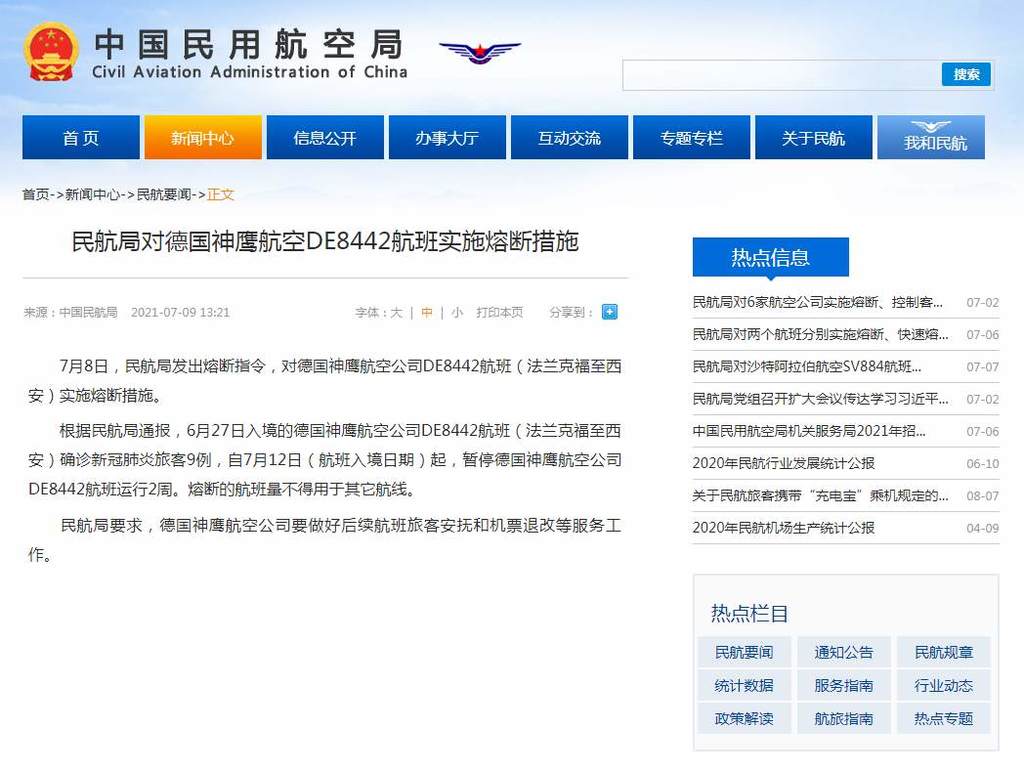 7月8日,民航局发出熔断指令,对德国神鹰航空公司DE8442航班(法兰克福至西安)实施熔断措施。