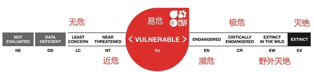 据悉,世界自然保护联盟濒危物种红色名录将物种濒危等级划分为7个等级,由高到低分别为:灭绝、野外灭绝、极危、濒危、易危、近危、无危。