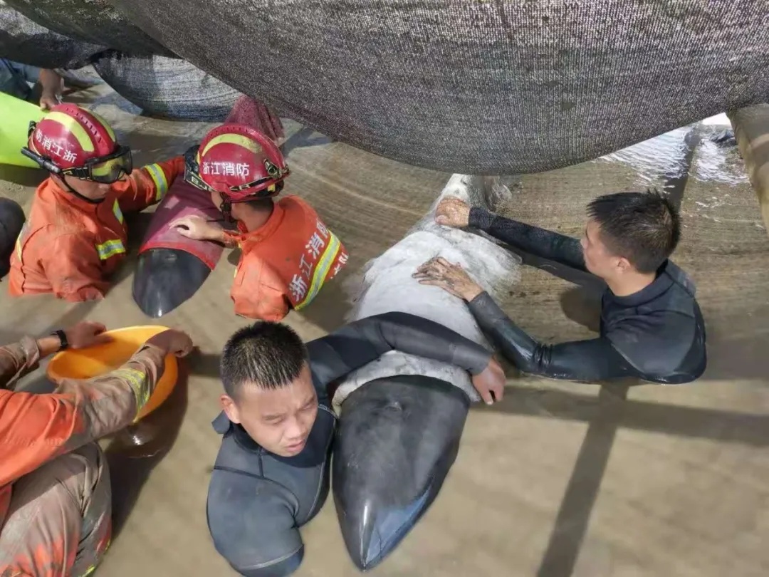 再比如,7月6日,12头瓜头鲸在浙江台州临海一滩涂搁浅,救援人员和上千热心群众在30多度的高温下展开了长达10多个小时的生死营救。