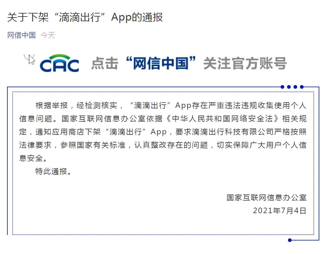 根据举报,经检测核实,“滴滴出行”App存在严重违法违规收集使用个人信息问题。国家互联网信息办公室依据《中华人民共和国网络安全法》相关规定,通知应用商店下架“滴滴出行”App,要求滴滴出行科技有限公司严格按照法律要求,参照国家有关标准,认真整改存在的问题,切实保障广大用户个人信息安全。