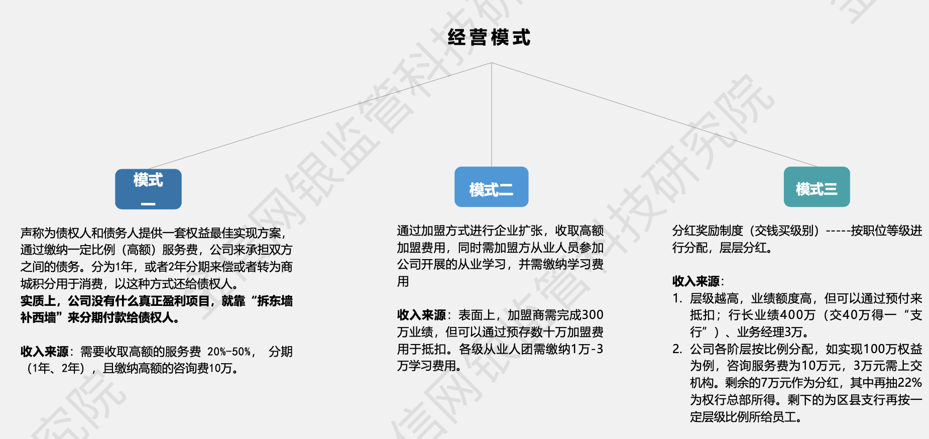 据有关机构宣传,解债服务方承诺通过以物抵债等方式使得解债申请人取得双倍的解债金额的现金回收,但实际解债服务方并未调查债权债 务的真实性,也没有向债务人进行催收,为了达到这个回报率债事服务方势必会采取“拆东墙补西墙”的“庞氏骗局”使游戏继续进行。一旦资金链断裂,解债申请人不仅债权本金没有着落,而且还存在交纳的解债资金无法收回的风险。
