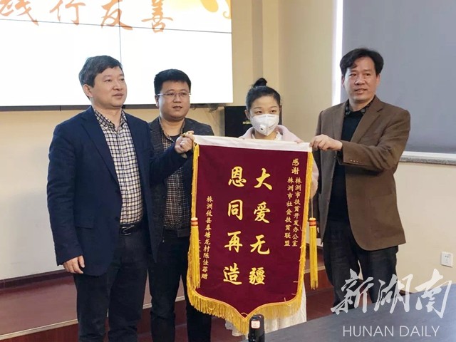 攸县女孩陈佳菲将书有“大爱无疆,恩同再造”的锦旗送至株洲市扶贫办和株洲市社会扶贫联合会表示谢意。早前她因患病而一贫如洗、身陷囹圄,在株洲市扶贫办和株洲市社会扶贫联合会帮助下,这位花季女孩涅槃重生。