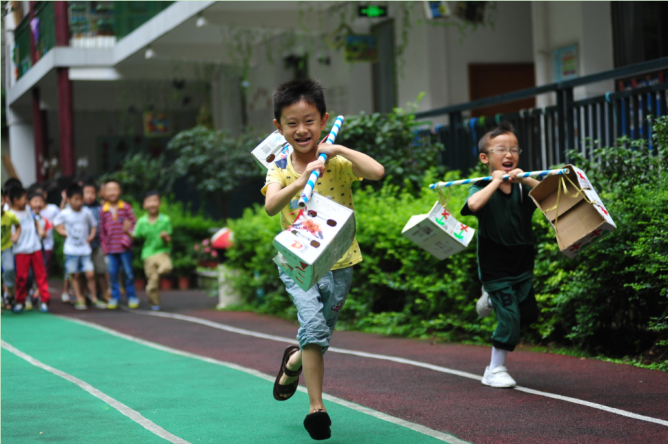 第二阶段:全院同玩。在经过了前期大量的准备工作后,民间游戏走进了省一幼。要想孩子会玩,老师首先要会玩。于是,省一幼通过全院教研、集体备课、工会活动等多种方式,让老师重温跳竹竿、跳皮筋、打陀螺、滚铁环等经典民间游戏玩法。老师带来的高级榜样激发了孩子同玩的乐趣。接着,在户外活动、晨间活动中,随处可见老师与孩子们一起玩民间游戏的场景,民间游戏本身的趣味性、挑战性与合作性,引得孩子们乐在其中,建构起自由欢乐的游戏生态,幼儿园到处充满着幼儿的欢笑声。