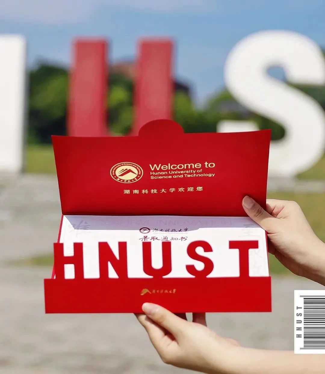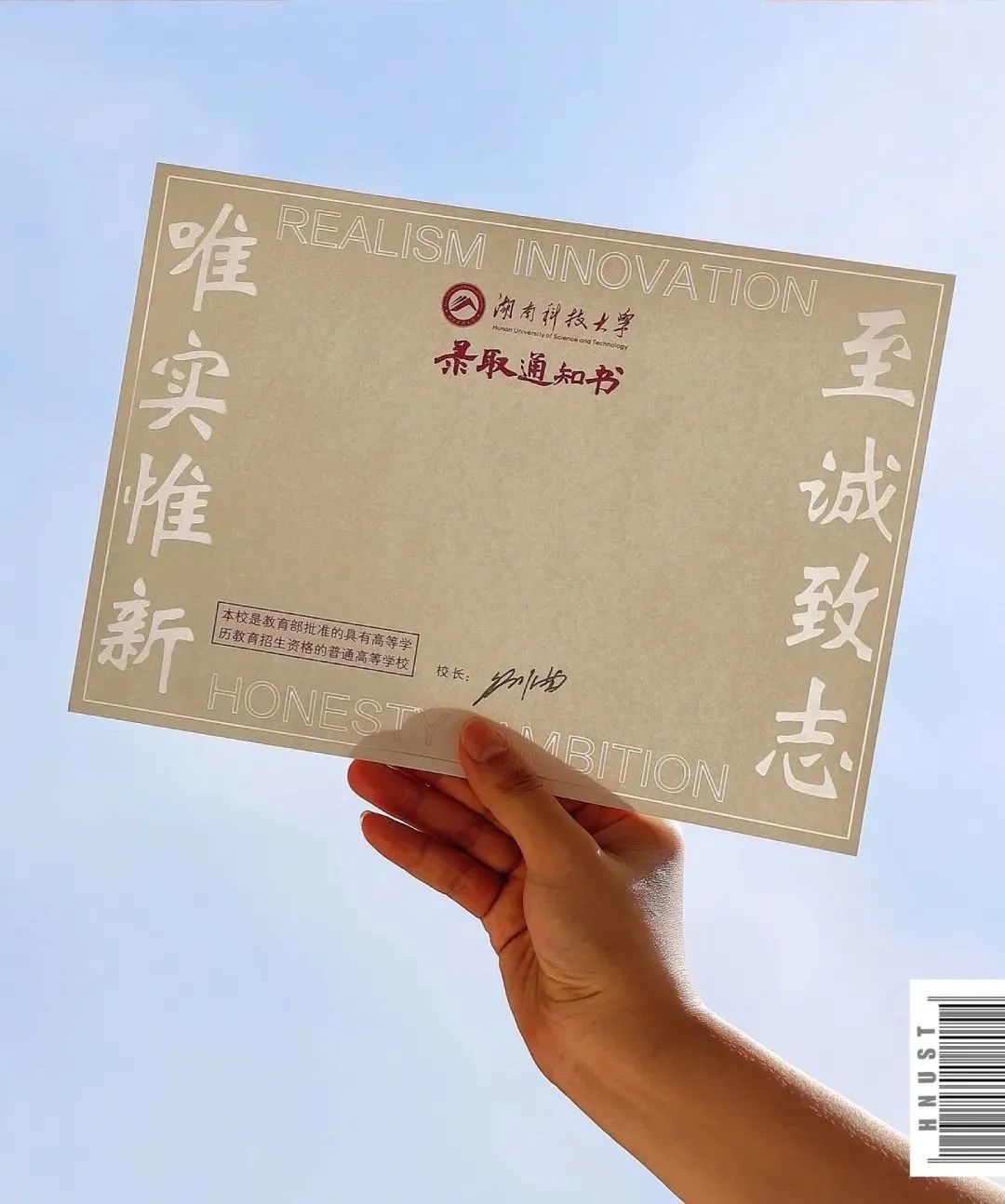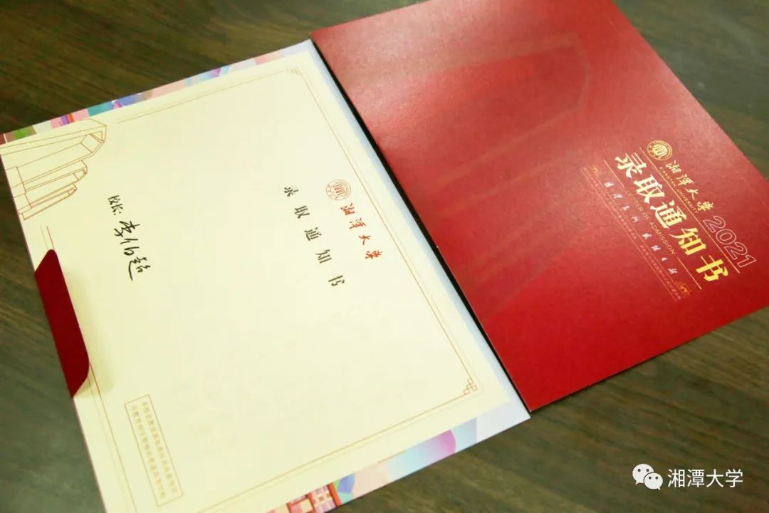 湘潭大学录取通知书以红色为底,寓意“传承红色基因,以红色文化立德树人”。上部湘潭大学logo(校名、校徽);中部为烫金“录取通知书”,校训“博学笃行,盛德日新”;底部是湘潭大学标志性建筑:三道拱门。