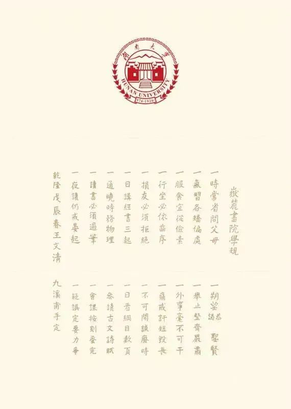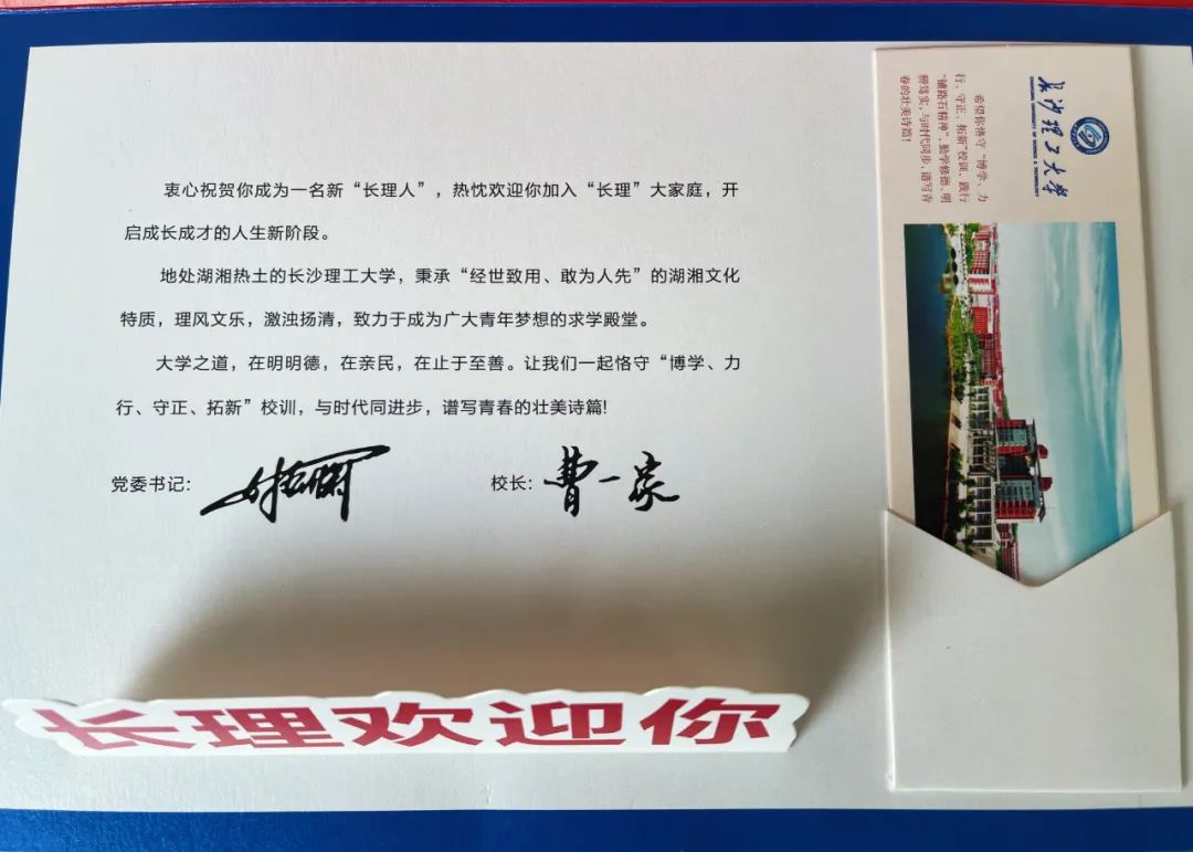 通知书背面手绘湘大标志性建筑:三道拱门如山般高昂,催人奋进,跨入三拱门,在“文”“理”“工”的世界里尽情徜徉;乳白色的图书馆是连接古今中外的桥梁,在这里,湘大学子们与历史对话,和未来交手;砖红色墙壁、庄重的钟楼迸发出奇妙的化学反应,学生的青春才华在这里得到施展。