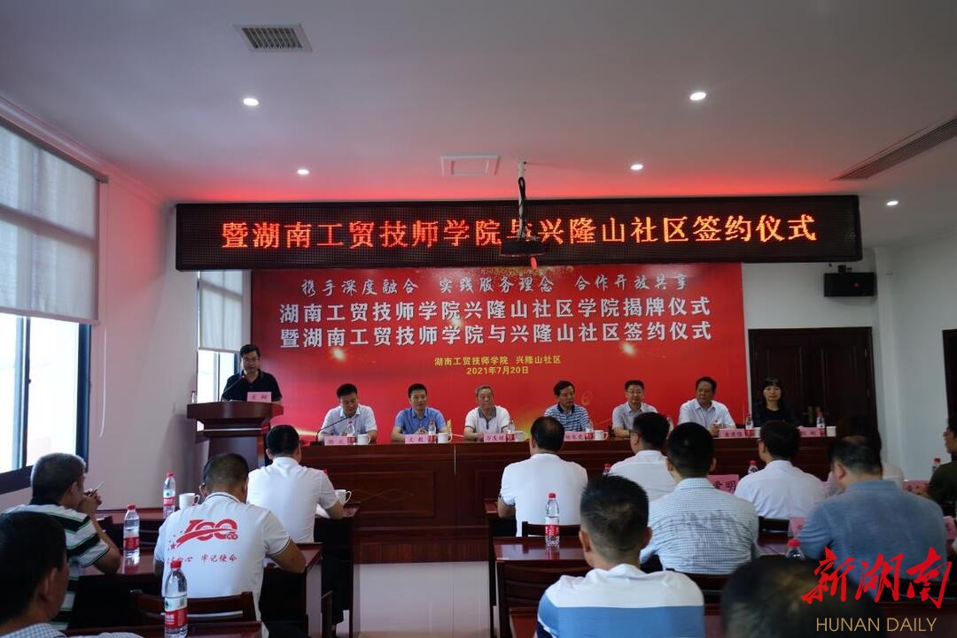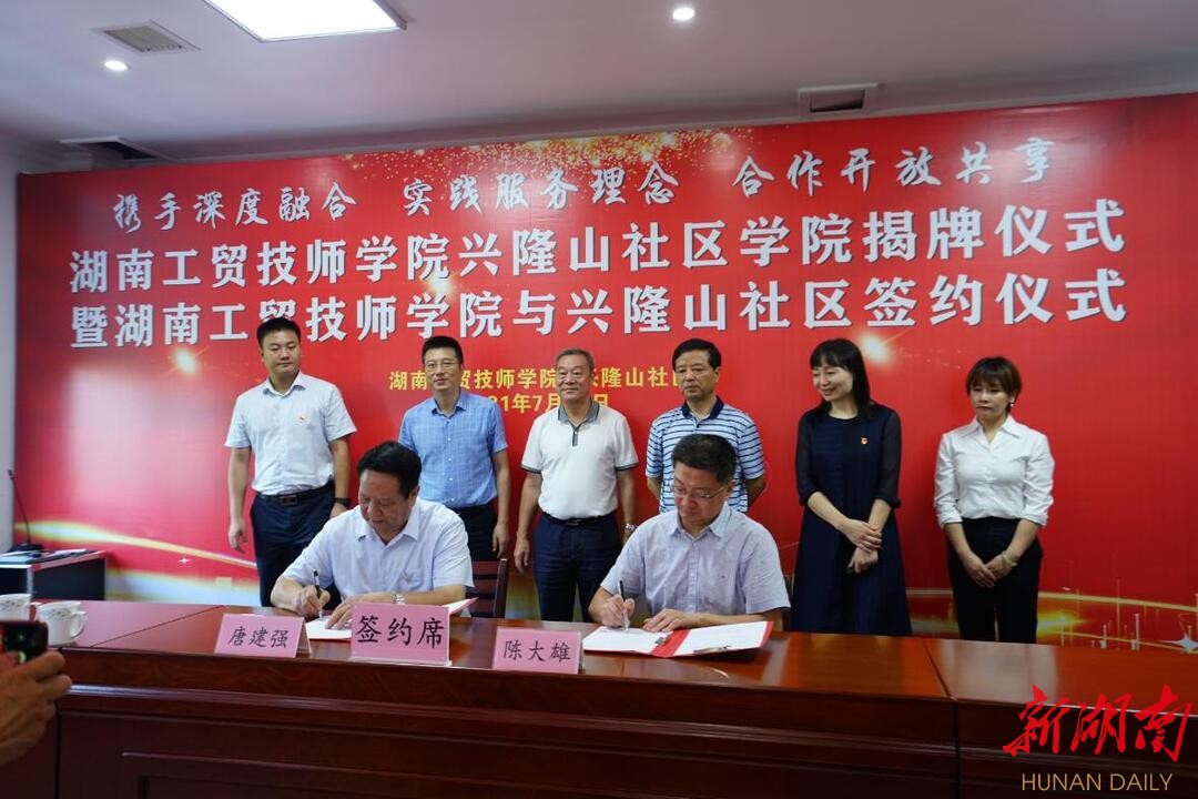 当天的揭牌仪式在株洲经开区龙头铺街道兴隆山社区进行,湖南工贸技师学院党委副书记、院长陈大雄与社区党委书记唐建强签订建立兴隆山社区学院基地协议。社区学院由学院和街道社区共同建设,学院为主负责教学活动,街道社区负责提供场地及相关设施,所有教学培训实行免费。湖南工贸技师学院是一所以培养高技能人才为主要目标的高等职业院校,服务地方是学院的重要职责。学院将发挥职业技能人才、师资、科研、技术优势,为社区居民以及企业职工提供主题教育、义务宣讲、技能教育、技能培训、技能鉴定、志愿服务等方面的服务,共同推进社区现代化建设。