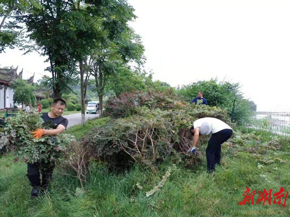 目前正值三伏天,君山岛上的气温也在逐步升高。在胡建湘的带领下,园容突击队的队员们并没有因为酷暑难耐而简化园容维护工作流程,而是顶着烈日、耐着炽热、踏着酷暑,依旧每天穿梭在参天大树和茂密草丛之中,不停地检查、修剪,任凭汗水浸透衣服,荆刺扎伤皮肤。