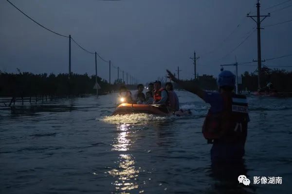7月25日19时许,河南省新乡市牧野区北原庄村一片汪洋,宛如一座“孤岛”,长沙市岳麓区蓝天应急救援队乘船进入村庄,转移受灾群众。