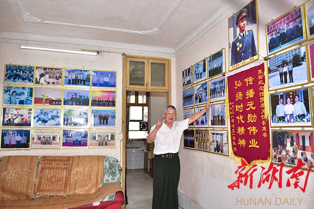 在会同县林城镇一处小院的三楼,一套面积仅50余平方米的旧砖房,这就是罗本义的家。客厅墙上,挂满了罗本义在各处演讲的合影,一幅粟裕大将的戎装半身照摆在墙上正中间,下面挂着一面写有“传播元勋伟业,弘扬时代精神”的锦旗。
