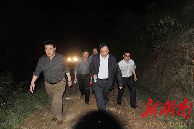 上图:2013年5月11日晚,蒙汉(前右一)夜行在沿溪乡瓦庄村调研“断头路”建设。