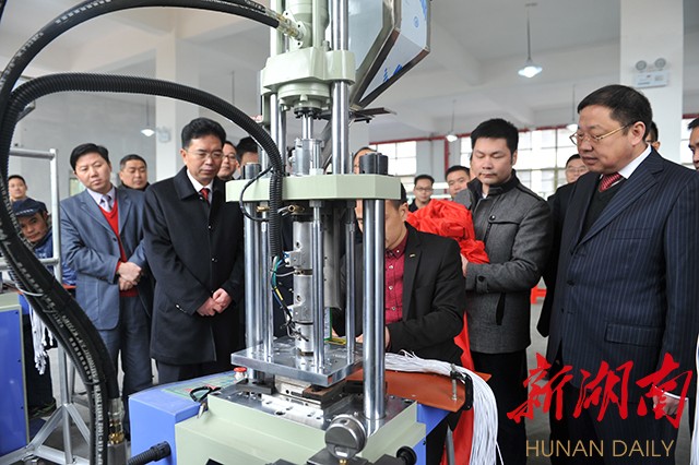 上图:2016年1月15日,溆浦县红花园工业园首家企业投产,蒙汉(右一)带领县领导前来祝贺。