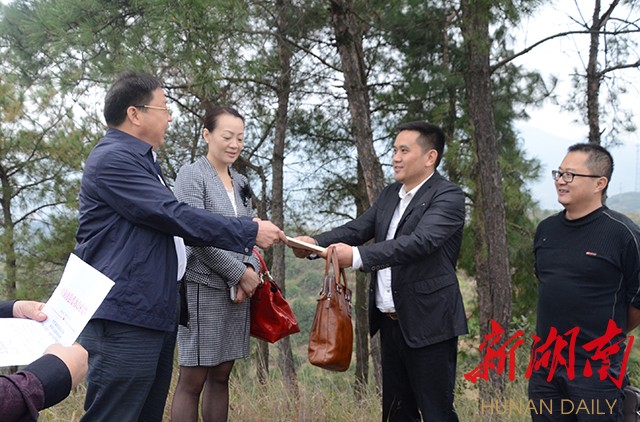 上图:2013年10月16日,蒙汉(左一)在溆浦县红花园工业园山坡上为园区新任班子颁发任命文件。