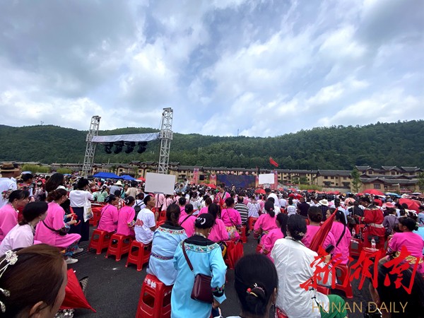 新湖南客户端7月15日讯(通讯员 龙珍 黄玉芳 黄文渊 田儒斌)苗岭飞歌迎盛世,木叶声声传佳情。7月15日,时值农历“六月六”节,在湖南省湘西土家族苗族自治州凤凰县禾库镇易地扶贫搬迁安置区举行中国·凤凰“六月六”禾库苗歌会暨凤凰灡泉酒厂剪彩仪式。来自湘黔边区苗族同胞及游客数万人会聚于此,以歌会友、以鼓传情,以长龙宴待客,共同欢度中国·凤凰“六月六”禾库苗歌会,为天下宾朋送上一道道丰盛的原生态民俗文化盛宴。