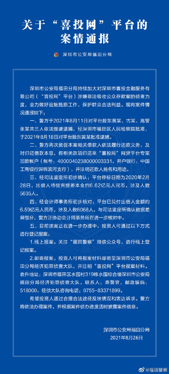 8月26日,深圳市公安局福田分局发布关于喜投网”平台的案情通报。