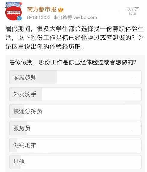 兼职种类那么多,哪些是大学生之间的热门选择呢?据南都最近发起的一项投票显示,大学生兼职热门行业日趋多元,相比于传统的服务员、地推类兼职,如今的大学生们更偏向于新业态发展下的新职业。投票显示,有25%的学生希望体验或从事过外卖骑手,热度仅次于家教。