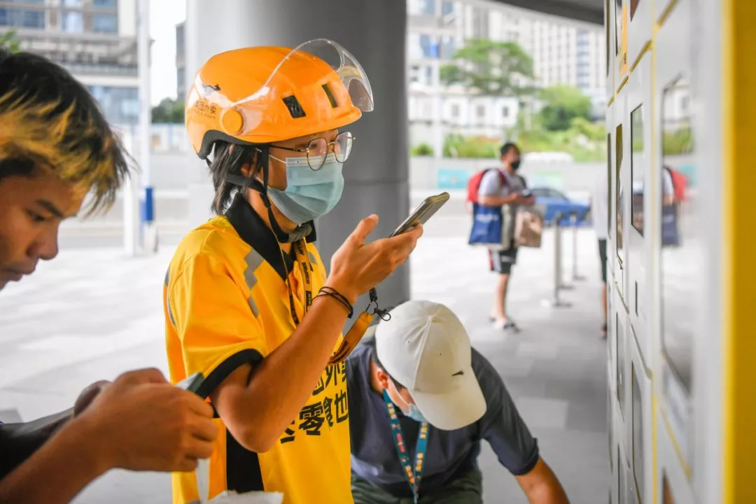 黄炜雯与顾客沟通把餐品放到外卖取餐柜