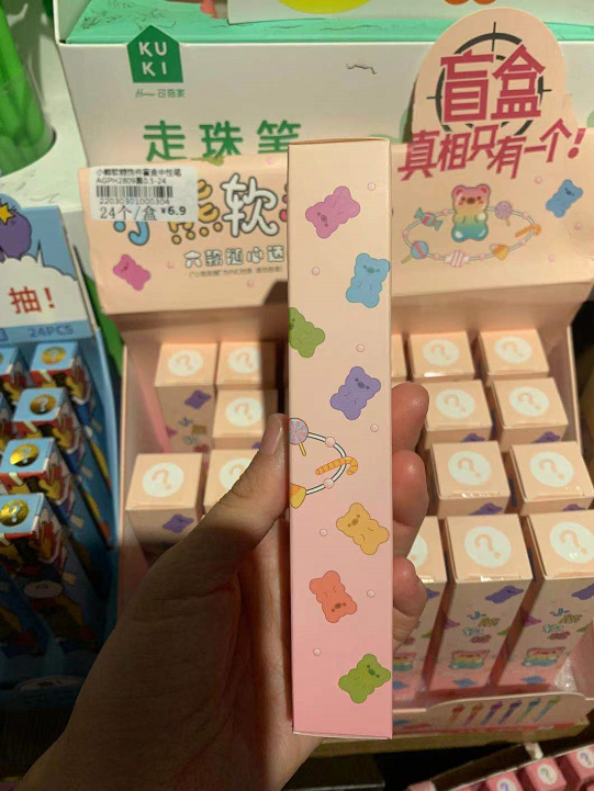 “这是文具盲盒,里面有一支笔,一张卡片,一张贴纸,一共有14种图案。”看着记者手中巴掌大的纸盒,店内的销售人员介绍说,现在这种文具盲盒很“火”。