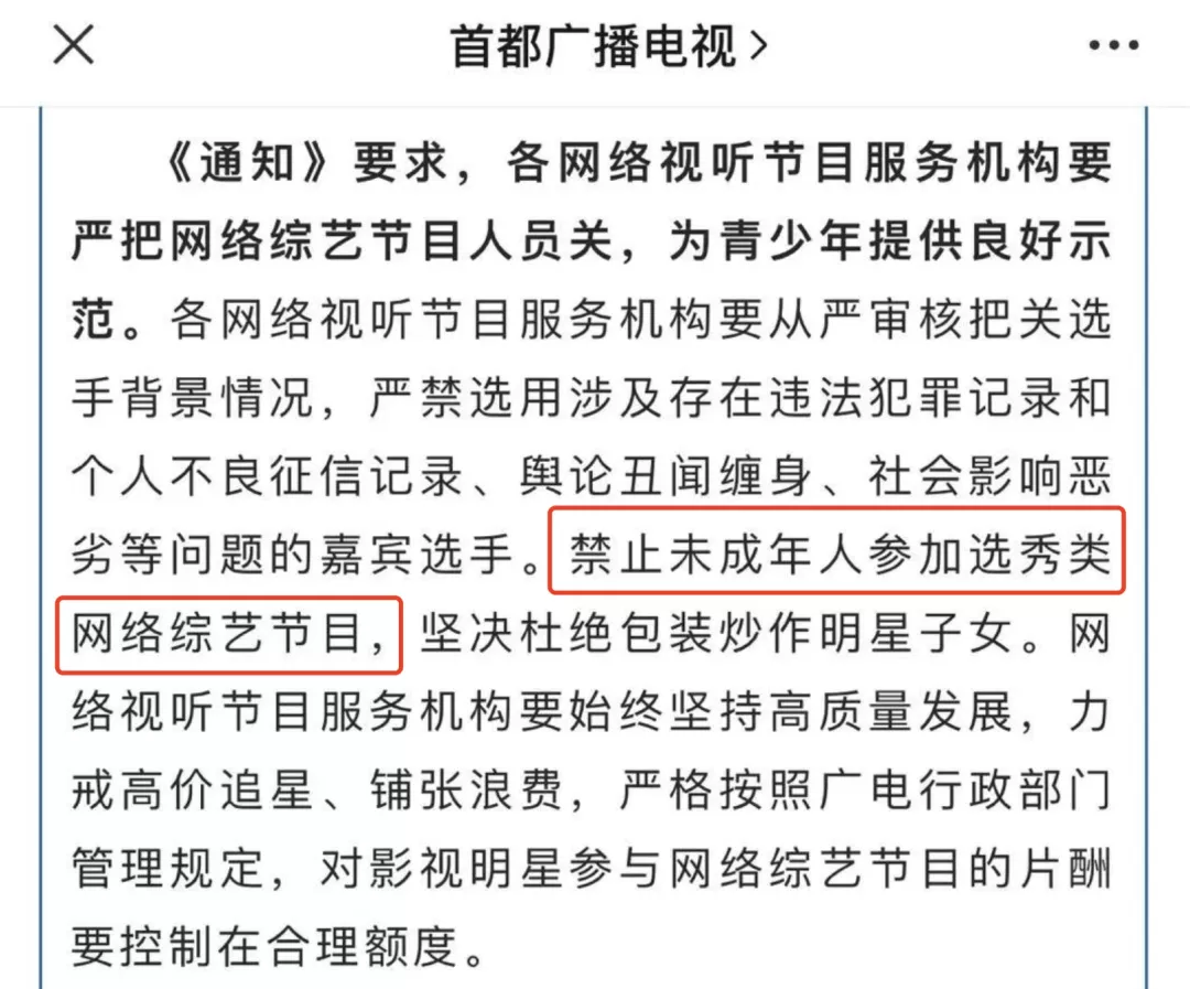 5月10日,北京市广电局也发布通知,各网络视听节目服务机构要严把网络综艺节目人员关,为青少年提供良好示范。禁止未成年人参加选秀类网络综艺节目,坚决杜绝包装炒作明星子女。