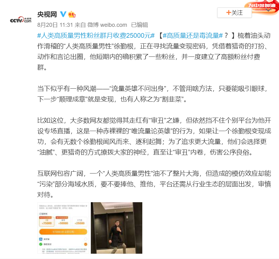 央视网对此发评论称,大多数网友都觉得其走红有“审丑”之嫌,但依然挡不住个别平台为他开设专场直播,这是一种赤裸裸的“唯流量论英雄”的行为,如果让一个徐勤根变现成功,会有无数个徐勤根闻风而来、逐利起舞;为了追求更大流量,他们会选择更“油腻”、更猎奇的方式撩拨大家的神经,伤害公序良俗。
