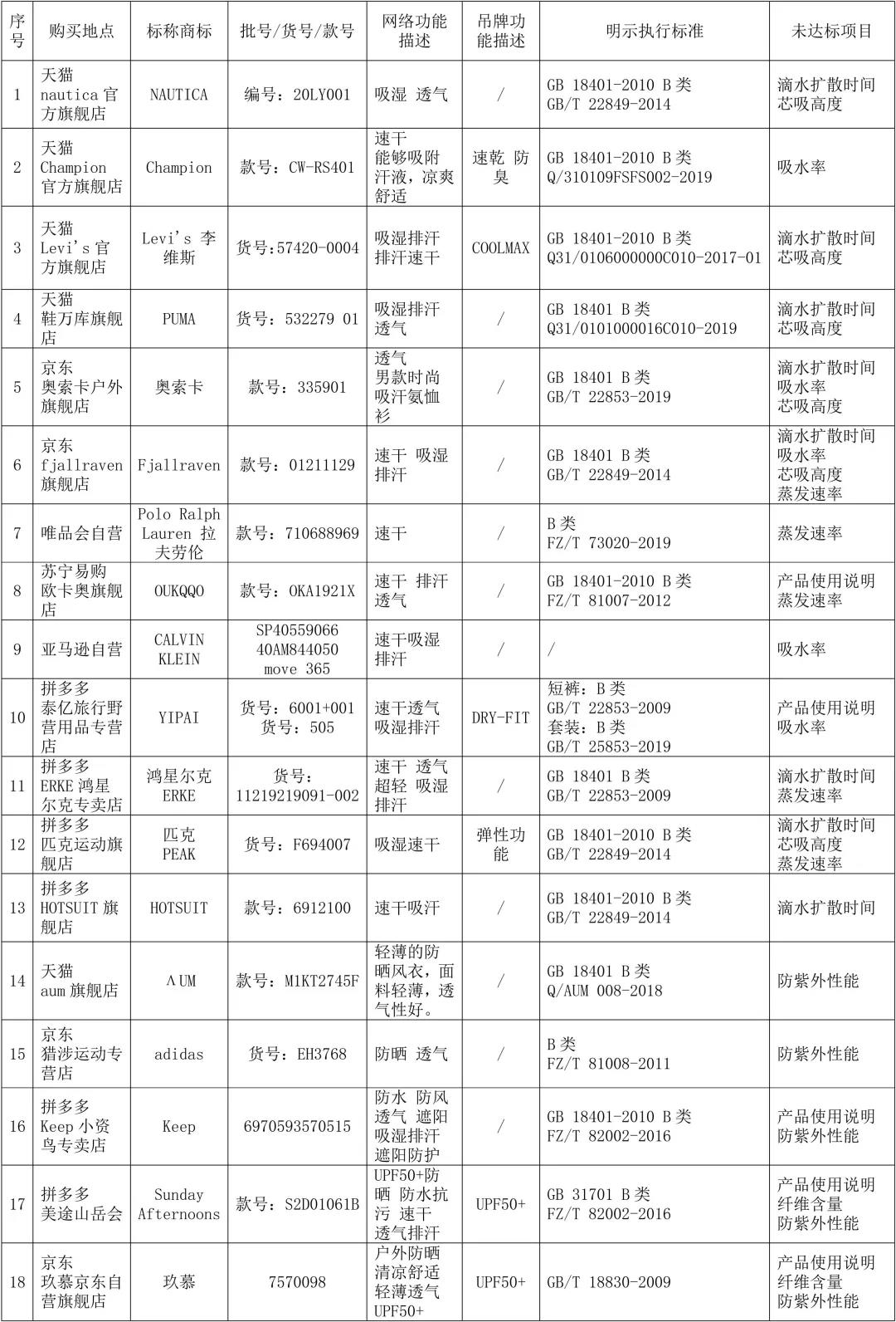 防紫外性能、防晒性方面,40件防晒类样品中,吊牌未标注防晒功能,网页宣传宣称具有该功能的样品有14件,吊牌和网页宣传均宣称具有该功能的样品有26件。未达到防紫外性能标准或标称要求的有5件,涉及AUM、adidas、Keep、Sunday Afternoon等品牌样品。