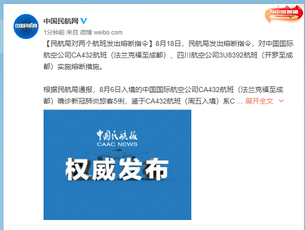 8月18日,民航局发出熔断指令,对中国国际航空公司CA432航班(法兰克福至成都)、四川航空公司3U8392航班(开罗至成都)实施熔断措施。