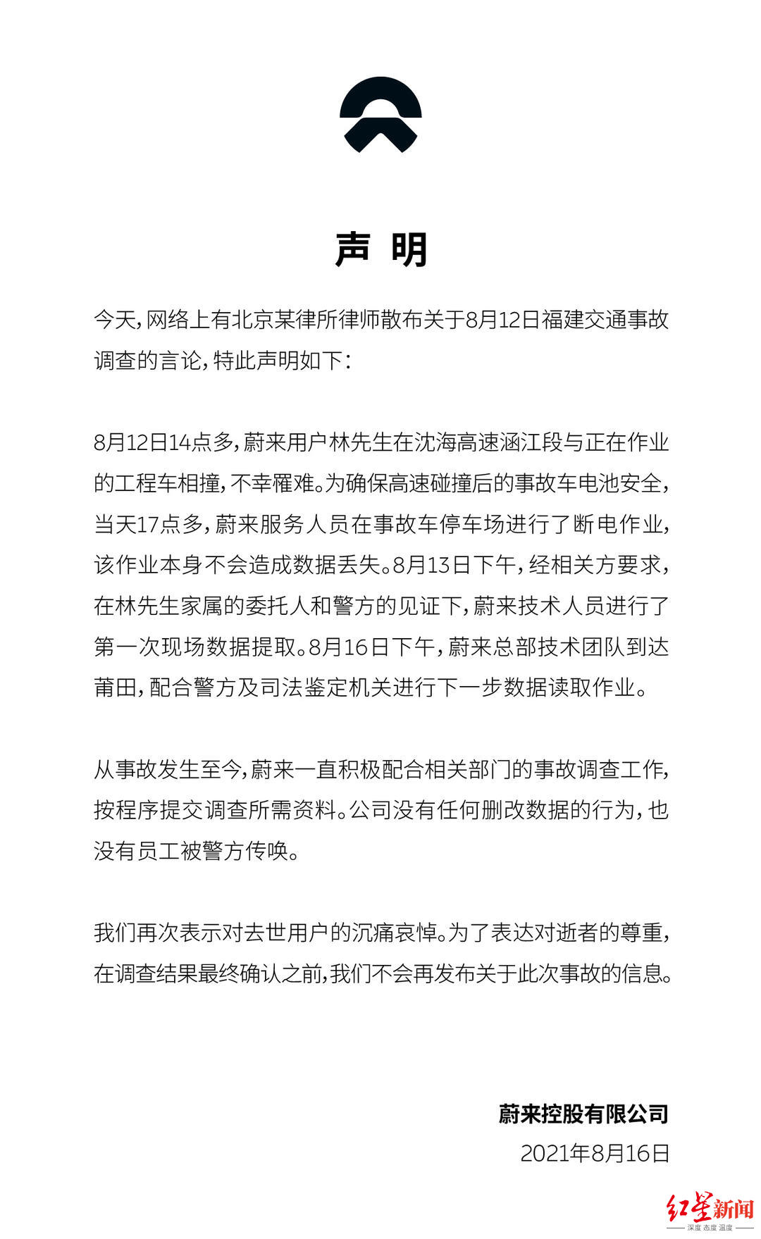 从事故发生至今,蔚来一直积极配合相关部门的事故调查工作,按程序提交调查所需资料。公司没有任何删改数据的行为,也没有员工被警方传唤。
