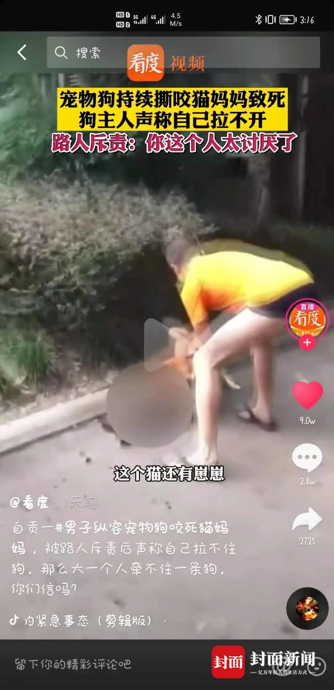 一只成年柴犬死死咬住一只黑色猫咪的脖子,猫咪不断挣扎,柴犬死不松口。猫咪的挣扎越来越弱。柴犬的主人——一名中年男子只是象征性地拉了拉绳子、拍拍爱犬的脖子,完全没有制止住柴犬对猫咪施暴。最终,黑色猫咪在被牵着绳子的柴犬口下活活被咬死。