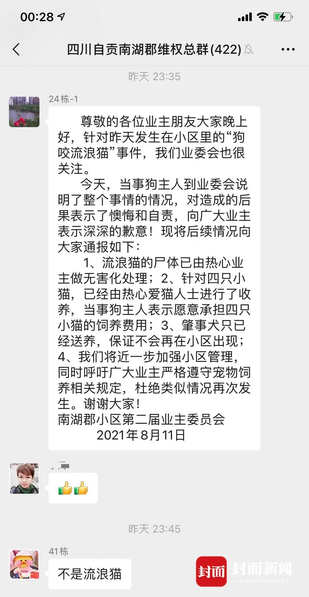 “通报”称,猫咪的尸体已经热心业主无害化处理,4只小猫已由爱心人士收养,狗主人愿意承担饲养费用。肇事犬只已经送养,保证不再在小区出现等等。