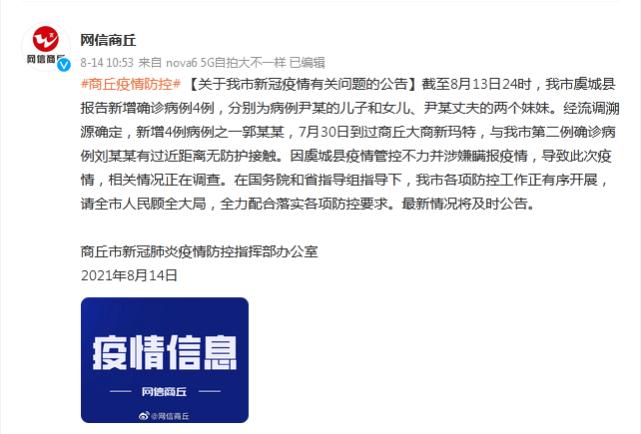 14日,河南省商丘市新冠肺炎疫情防控指挥部办公室发布公告称,截至8月13日24时,商丘市虞城县报告新增确诊病例4例,分别为病例尹某的儿子和女儿、尹某丈夫的两个妹妹。