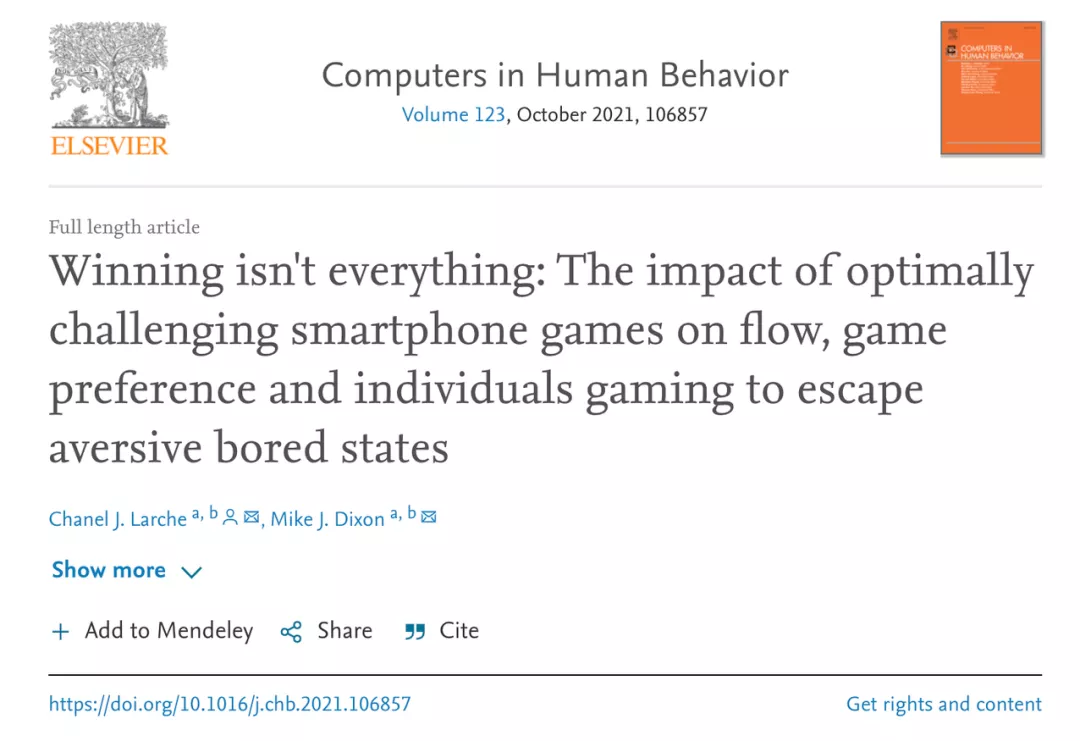 相关研究论文以 “Winning isn't everything: The impact of optimally challenging smartphone games on flow, game preference and individuals gaming to escape aversive bored states” 为题,已于近期发表在科学期刊《人类行为计算》上。滑铁卢大学认知神经科学博士 Chanel Larche 与认知神经科学教授 Michael Dixon 共同完成了这项研究。