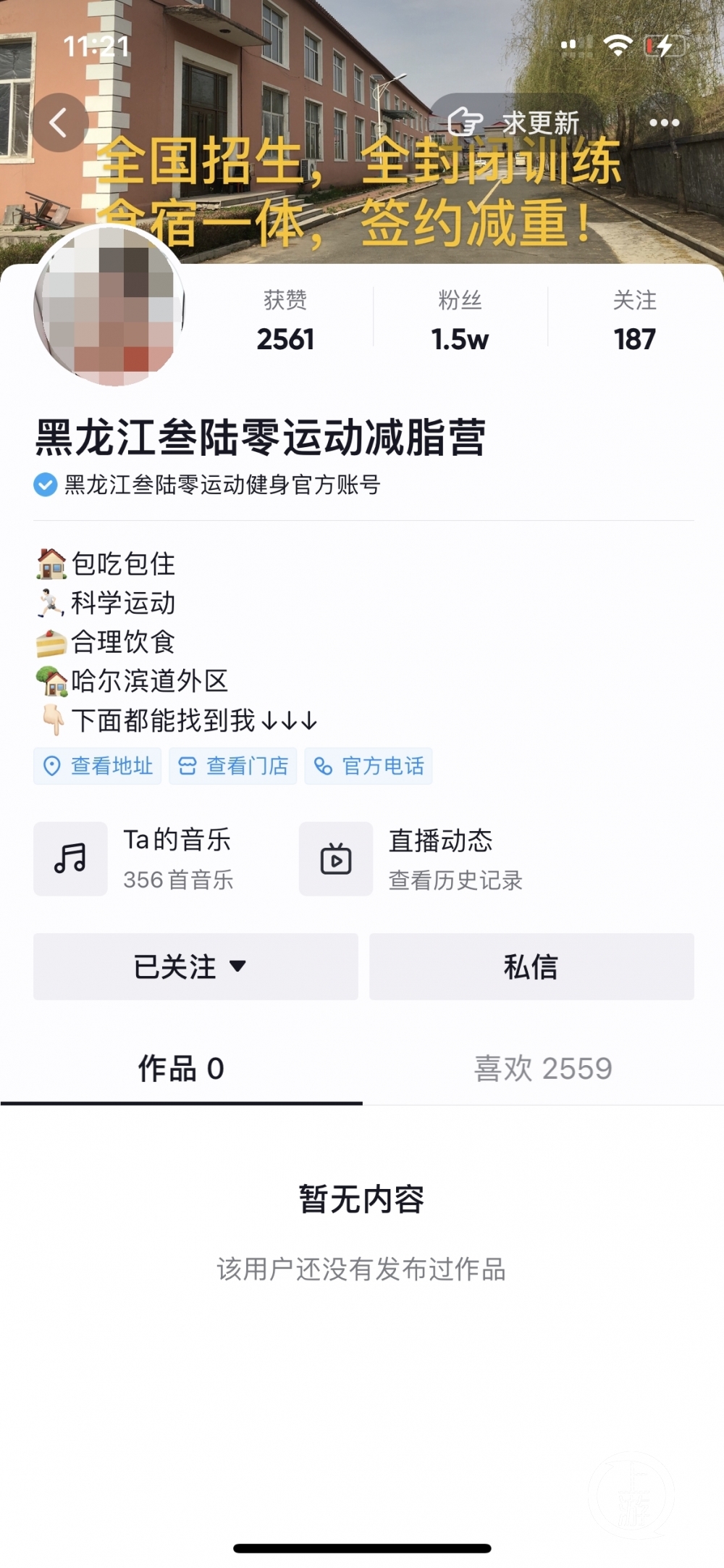 记者调查发现,这家减肥训练营在当地比较有名,社交平台上发布了很多广告以及宣传视频。训练营所在地此前为一家驾校,宿舍与训练场地均由驾校办公楼改造而成。360减肥训练营的抖音账号“黑龙江叁陆零运动减脂营”发布内容均为学员减肥情况,该账号称,可全国招生,全封闭训练,包吃包住、科学运动、合理饮食。