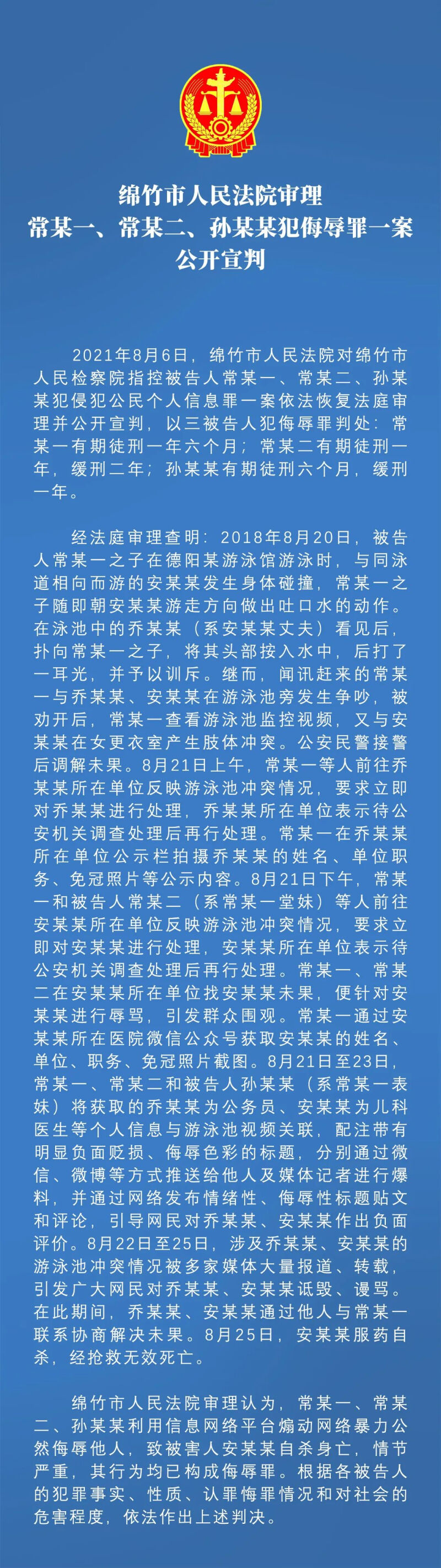 8月6日,绵竹市人民法院对绵竹市人民检察院指控被告人常某一、常某二、孙某某犯侵犯公民个人信息罪一案依法恢复法庭审理并公开宣判,以三被告人犯侮辱罪判处:常某一有期徒刑一年六个月;常某二有期徒刑一年,缓刑二年;孙某某有期徒刑六个月,缓刑一年。