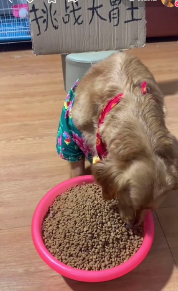 另一则视频中,博主则要求金毛犬吃下满满一脸盆狗粮。金毛犬身后,还特意摆放着写有“挑战大胃王”五个大字的纸板。镜头前,这只金毛犬只好一直埋头苦吃,眼见盆子里的狗粮越来越少,金毛犬被撑得打了个饱嗝,宣布挑战成功。记者发现,上千条短视频让这只金毛犬疲惫不堪,有时累到枕着馒头睡着了,结果还被博主拍醒,硬着头皮继续“工作”。而凭借这些视频,博主收割了超过175万的粉丝量。在他的小店里,售卖着宠物刷毛器等多款商品。