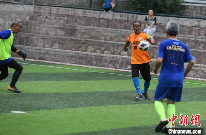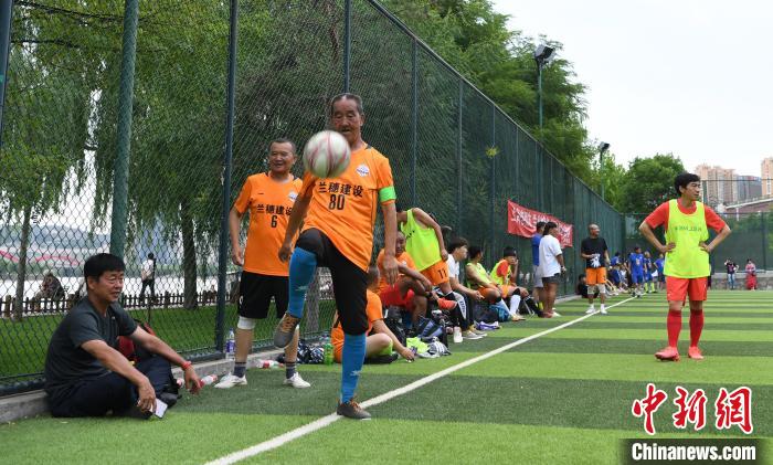 8月初,兰州体育公园的足球场上,80岁高龄的杨天昕在和队友踢足球。 杨艳敏 摄