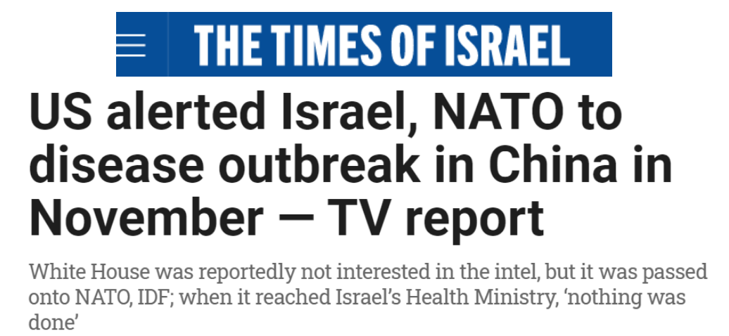 而更可疑的是,美国广播公司、美国有线电视新闻网和《以色列时报》等媒体去年曾分别报道,早在2019年11月,美国军方就和以色列、北约共享情报,预言冠状病毒大流行即将开始,情报中甚至提及了中国武汉。